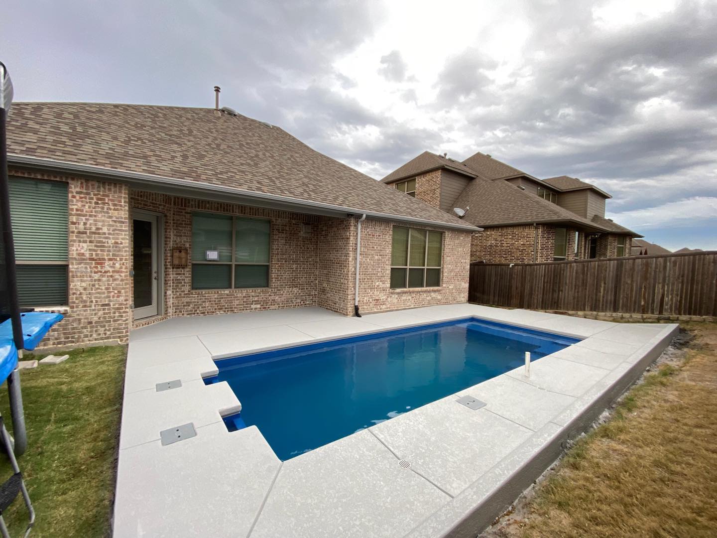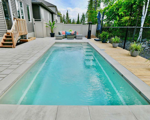 The Precision has a beautifully modern rectangular look with a large splash deck, perfect for your little ones to enjoy the pool with you. A single set of stylish stairs flow graciously into your large swimming space, with a flat bottom floor which is perfect for cooling down.